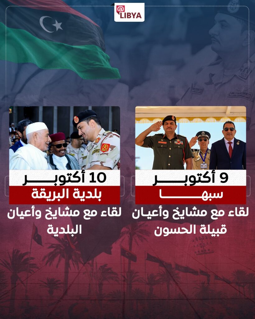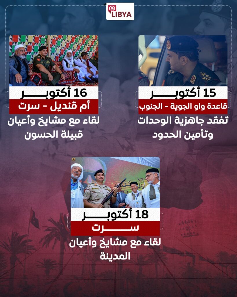 واختتم جولاته في 18 أكتوبر بلقاء مشايخ وأعيان مدينة سرت، حيث شدد على استمرار الجهود لتحقيق الأمن والاستقرار وتعزيز التواصل بين مؤسسات الدولة والمجتمع المحلي.