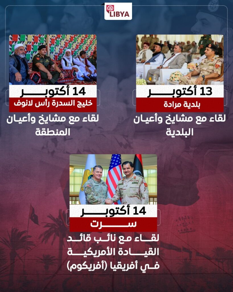 وفي 14 أكتوبر، عقد الفريق حفتر لقاءين منفصلين، الأول في خليج السدرة – رأس لانوف مع مشايخ وأعيان المنطقة، والثاني في مدينة سرت مع نائب قائد القيادة الأمريكية في أفريقيا (أفريكوم)، حيث جرى بحث سبل التعاون في مجال مكافحة الإرهاب وتعزيز الأمن الإقليمي.