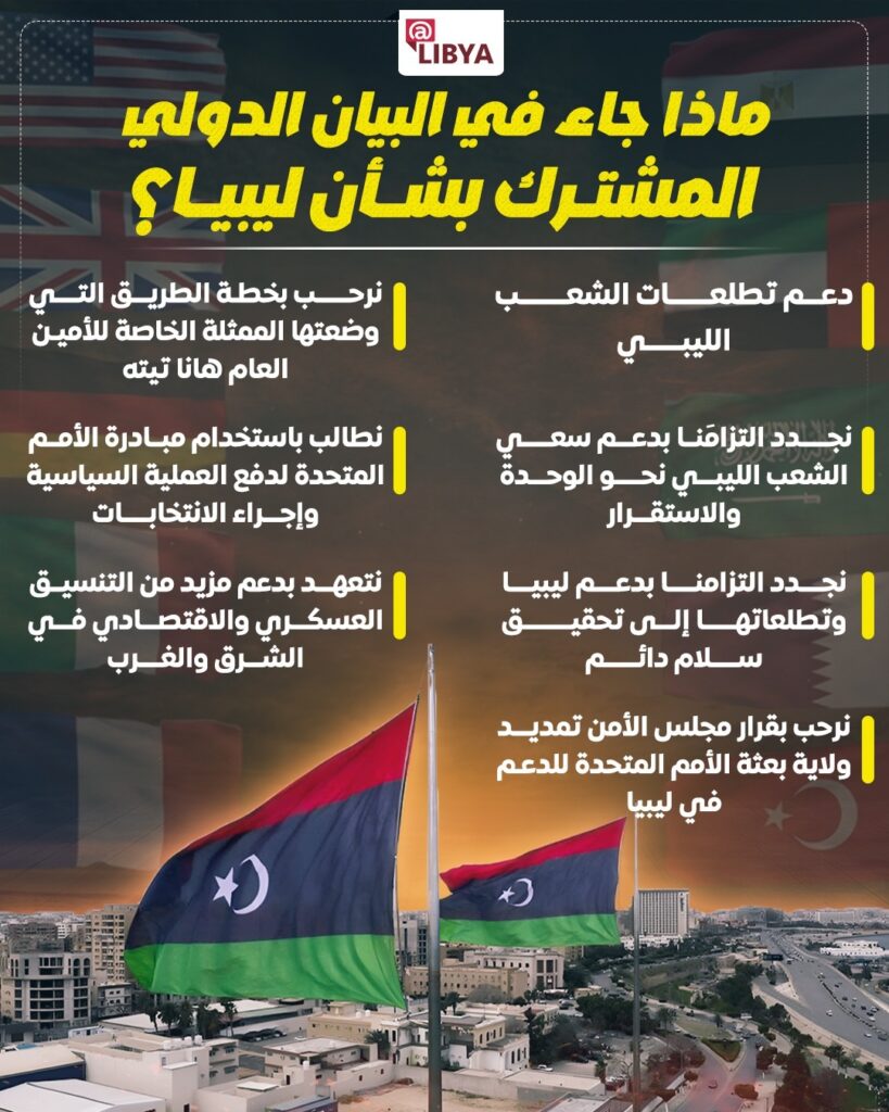 ورحبت الدول الموقعة بقرار مجلس الأمن الدولي تمديد ولاية بعثة الأمم المتحدة للدعم في ليبيا، وبخطة الطريق التي وضعتها الممثلة الخاصة للأمين العام هانا تيته، داعية جميع الأطراف الليبية إلى الاستفادة من هذه الخطة والتيسير الذي تقدمه البعثة لدفع عملية سياسية بقيادة ليبية نحو حوكمة موحدة وإجراء انتخابات.