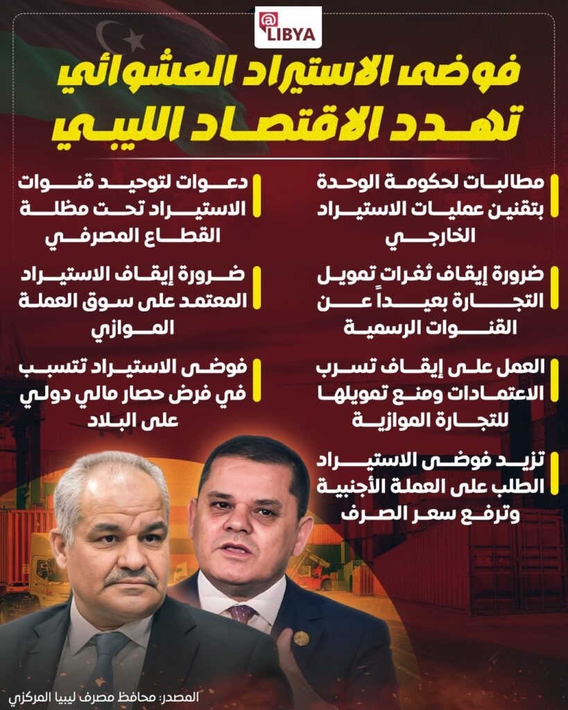 ودعا محافظ مصرف ليبيا المركزي حكومة الوحدة الوطنية إلى الإسراع بتوحيد قنوات الاستيراد وحصرها ضمن القطاع المصرفي، مع إيقاف كافة ثغرات تمويل التجارة بعيدًا عن القنوات الرسمية، ومنع الاعتماد على سوق العملة الموازي في عمليات الاستيراد، لما لذلك من أثر مباشر في زيادة الطلب غير المنضبط على النقد الأجنبي.
