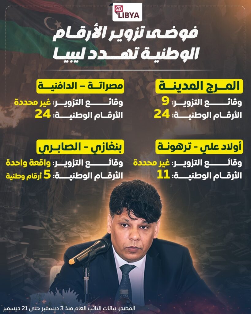 كشفت بيانات صادرة عن مكتب النائب العام عن تصاعد خطير في وقائع تزوير الأرقام الوطنية بعدد من المدن الليبية، في ظاهرة وُصفت بأنها تهدد منظومة السجل المدني وتمس الأمن القانوني والوطني للبلاد، خلال الفترة الممتدة من 3 ديسمبر وحتى 21 ديسمبر.
