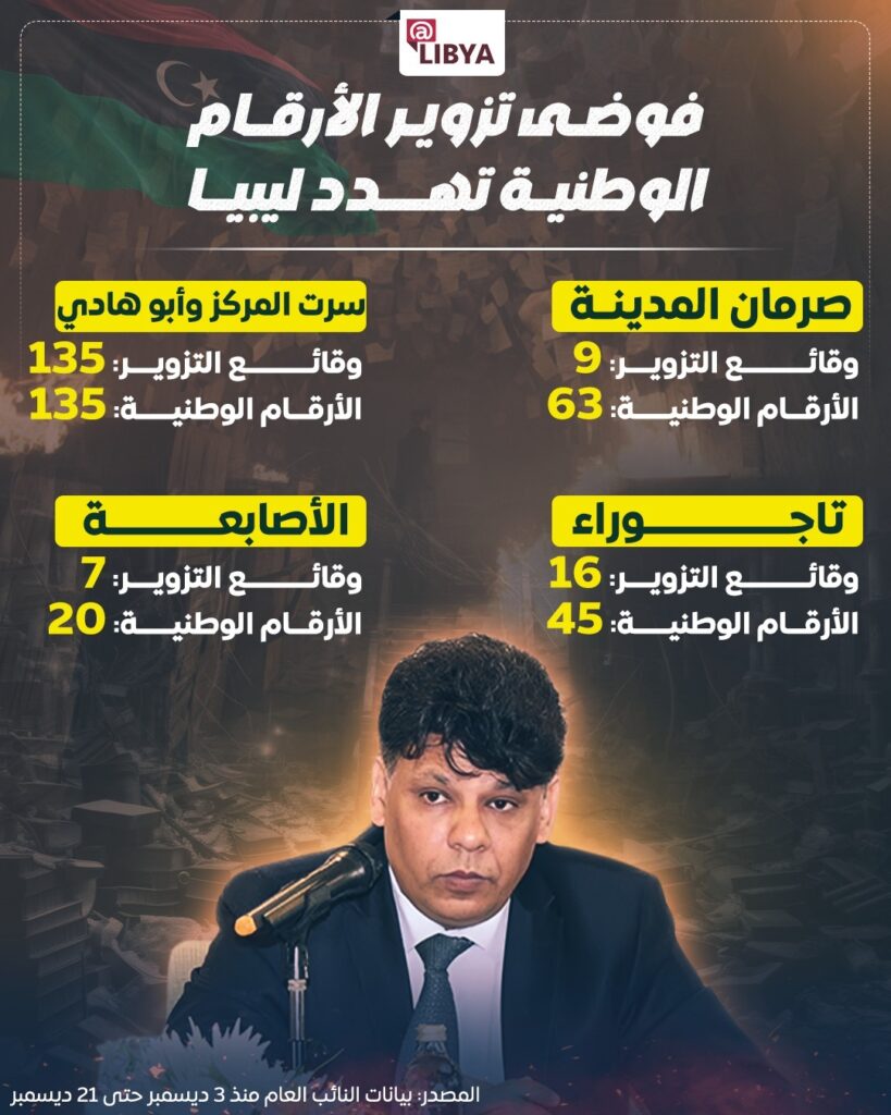 وأظهرت البيانات تسجيل وقائع تزوير متعددة في مدن ومناطق مختلفة، من بينها مدينة صرمان التي رُصدت بها 9 وقائع تزوير شملت 63 رقمًا وطنيًا، فيما شهدت منطقتا سرت المركز وأبو هادي 135 واقعة تزوير بعدد مماثل من الأرقام الوطنية. كما تم تسجيل 16 واقعة تزوير في تاجوراء طالت 45 رقمًا وطنيًا، و7 وقائع في الأصابعة شملت 20 رقمًا وطنيًا، إلى جانب واقعة واحدة في المرج المدينة طالت 24 رقمًا وطنيًا.