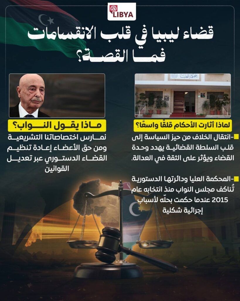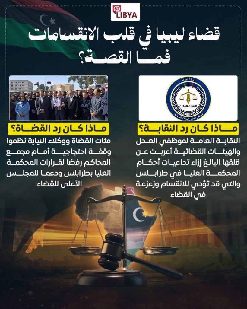 النقابة العامة لموظفي العدل والهيئات القضائية أعربت عن قلقها البالغ من تداعيات أحكام المحكمة العليا في طرابلس، محذرة من أن استمرار هذا المسار قد يؤدي إلى انقسام داخل الجسم القضائي، ويزعزع الاستقرار المؤسسي لمنظومة العدالة، في وقت تحتاج فيه البلاد إلى توحيد مؤسساتها لا تعميق الانقسامات.