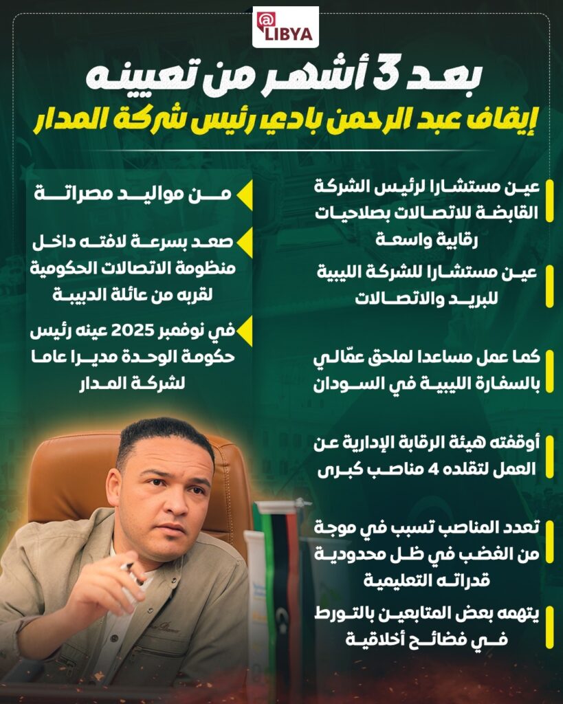 وبادي، المولود في مدينة مصراتة، صعد بسرعة لافتة داخل قطاع الاتصالات خلال فترة زمنية قصيرة، وسط حديث واسع عن قربه من عائلة رئيس حكومة الوحدة عبد الحميد الدبيبة، وهو ما اعتبره مراقبون عاملا أساسيا في تسارع مسيرته الوظيفية.
