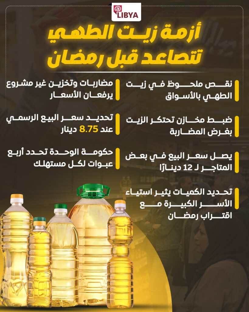 تشهد الأسواق الليبية خلال الأيام الأخيرة نقصًا ملحوظًا في زيت الطهي، مع تصاعد شكاوى المواطنين من اختفاء المنتج في بعض المناطق وارتفاع أسعاره في مناطق أخرى، وذلك قبيل حلول شهر رمضان، الذي يشهد عادة زيادة في الطلب على السلع الغذائية الأساسية.