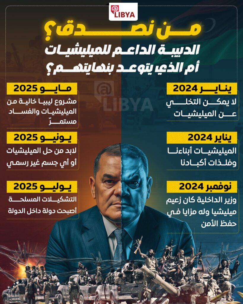 لكن بحلول منتصف 2025، تغيّر الخطاب بشكل لافت. ففي مايو، تحدث الدبيبة عن “مشروع ليبيا خالية من الميليشيات والفساد”، وأكد في يونيو على “ضرورة حل الميليشيات أو أي جسم غير رسمي”، قبل أن يعلن في يوليو أن “التشكيلات المسلحة أصبحت دولة داخل الدولة”.