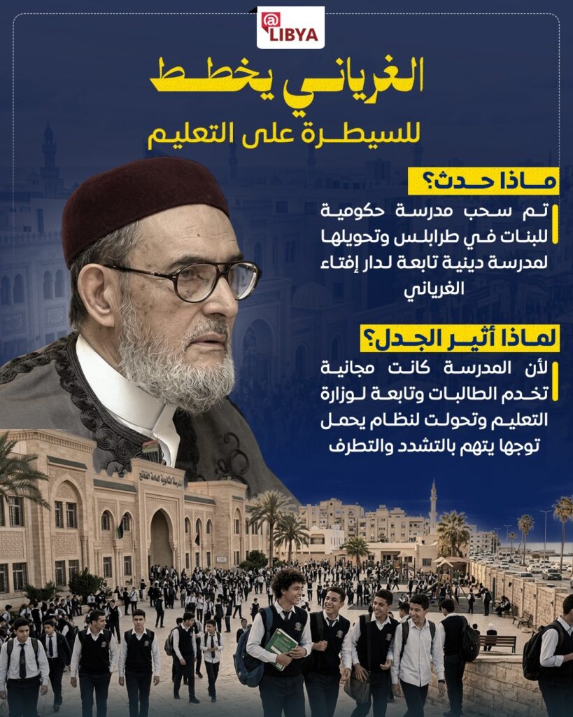 أثار الجدل مؤخرًا في العاصمة طرابلس بعدما تم تغيير تبعية إحدى المدارس الحكومية للبنات وتحويلها إلى مؤسسة تعليمية تابعة لدار الإفتاء الذي يترأسه المفتي المعزول من مجلس النواب الصادق الغرياني، ما فتح باب التساؤلات حول طبيعة هذا التحول وانعكاساته على قطاع التعليم في ليبيا.